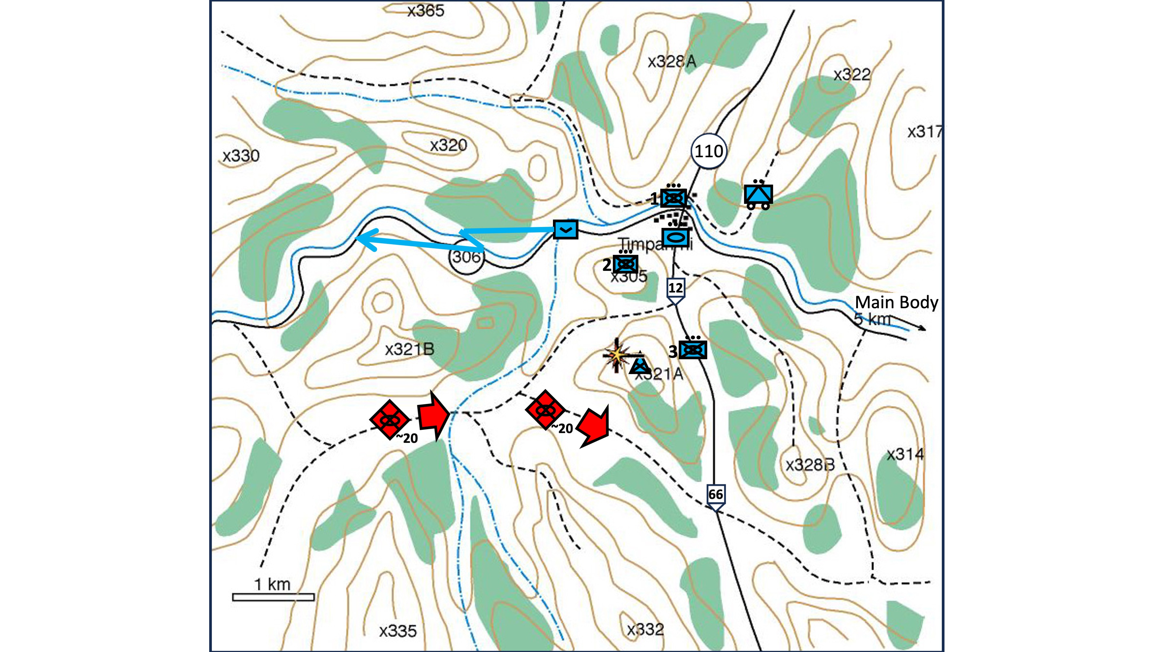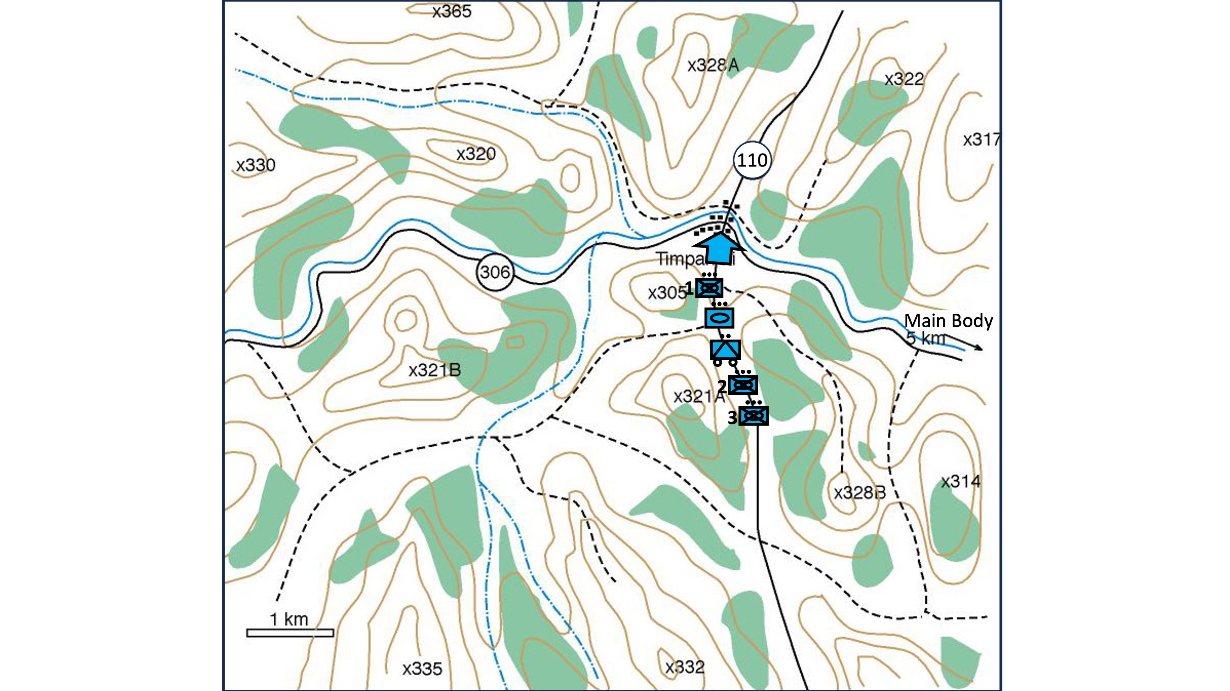 Bad weather has grounded the planned aviation support, so you put temporary observation posts (OPs) on the neighboring hills as you advance along Rte. 110 (although it slows your rate of movement). You reach the hamlet of Timpan-ni at the 110/306 intersection without incident, where you are instructed to hold your position.
